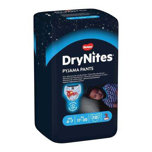 DryNites Mutandine assorbenti taglia M (4–7 anni/17–30 kg), di aiuto ai bambini che hanno problemi di pipì a letto. Offrono protezione per tutta la notte grazie ad uno strato sottile superassorbente che allontana il bagnato dalla pelle, alle barriere antifuoriuscite e ad un rivestimento esterno impermeabile. Le bande laterali elasticizzate assicurano una vestibilità avvolgente e mantengono il bambino asciutto e comodo per tutta la notte. Grazie ai divertenti disegni personalizzati per bambino e bambina, le mutandine sono molto simili alle mutandine tradizionali.